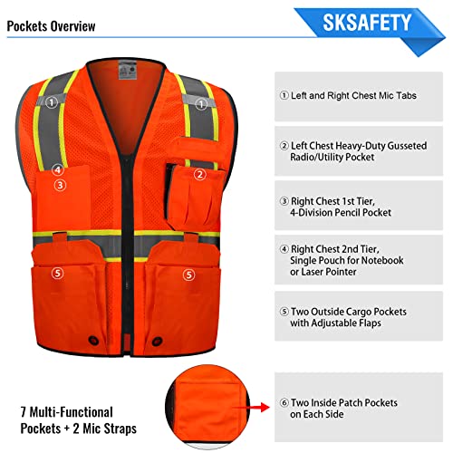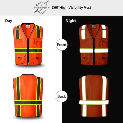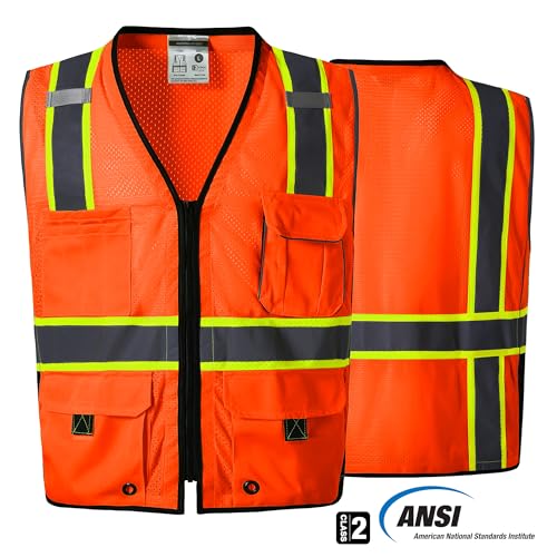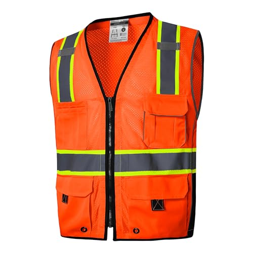 10 Pockets Professional Safety Vest, Class 2 Hi Vis Vest with Zipper, Reflective Strips, ANSI/ISEA Standard – Orange, 2XL