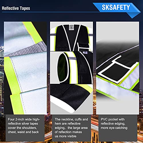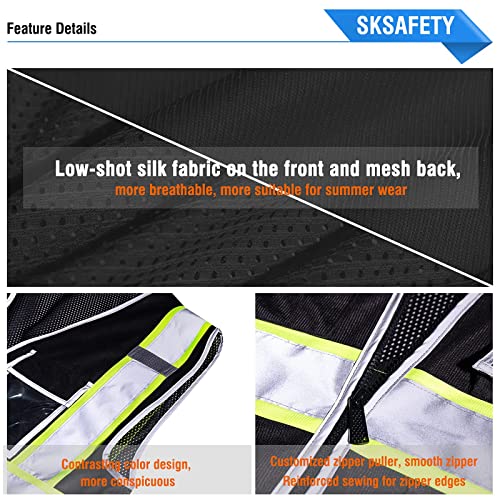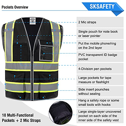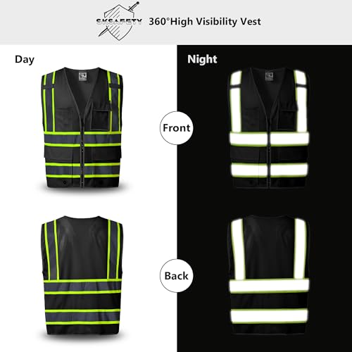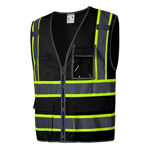 10 Pockets Safety Vest, Class 2 High Visibility Security with Zipper Back Mesh, Hi Vis Vest with Reflective Strips, ANSI/ISEA Standard, Construction Work Vest for Men & Women (Black, L)