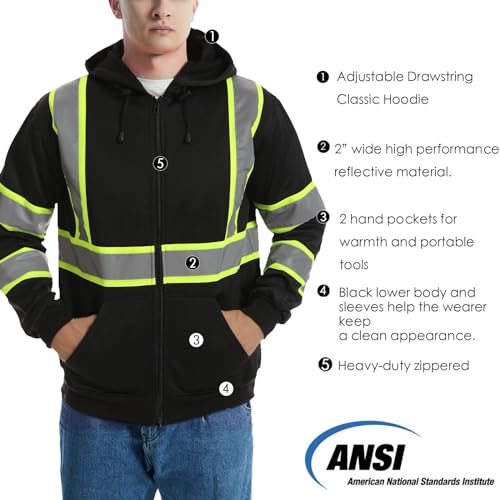 Hi Vis Work Safety hoodies for Men – Class 3 High Visibility Reflective Hoodie Jacket, High Vis Zipper Hoodie with Black Bottom, Construction Sweatshirts with Pockets