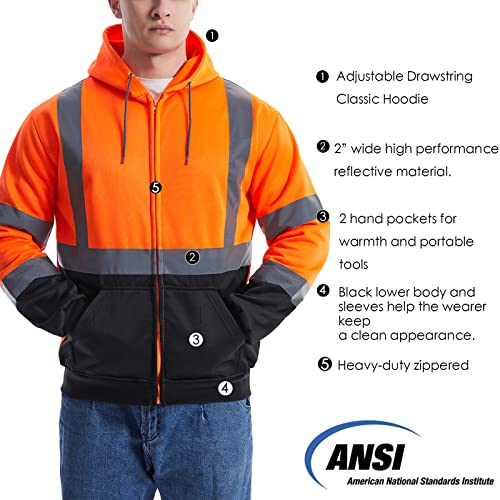 Hi Vis Work Safety hoodies for Men – Class 3 High Visibility Reflective Hoodie Jacket, High Vis Zipper Hoodie with Black Bottom, Construction Sweatshirts with Pockets