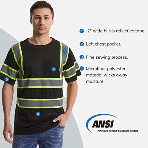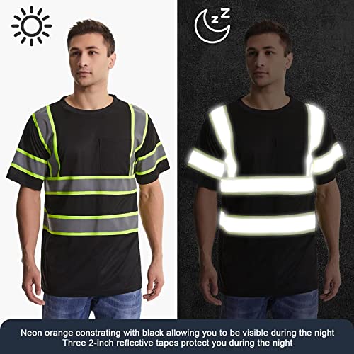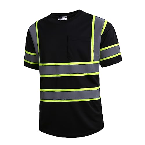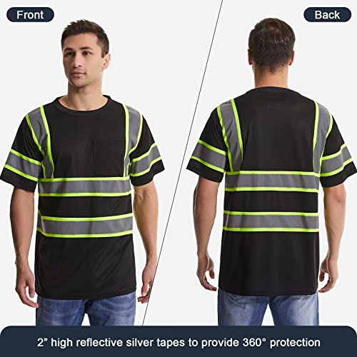 High Visibility Safety Shirts for Men with Reflective Tapes – Quick Dry Class 2 Hi Vis Construction Work Shirts for Men, Short Sleeve Breathable Birdeyes T-Shirts with Pocket Black
